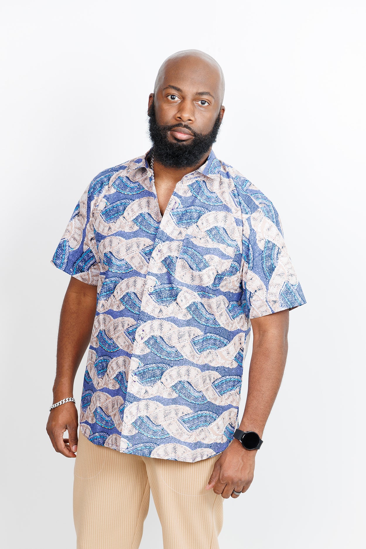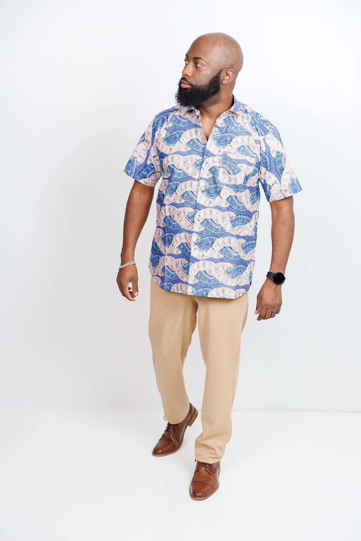 Elevate your style with our Men long sleeve shirt in a blue and white African print. Perfect for any occasion, this eye-catching shirt will make you stand out in the crowd. Show off your unique taste and embrace the bold, colorful culture with this must-have piece.