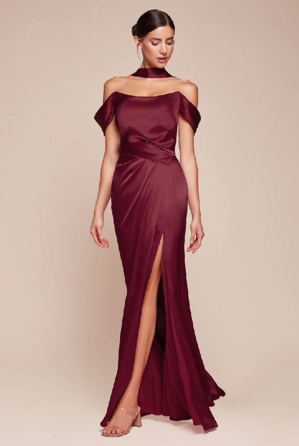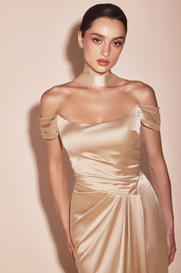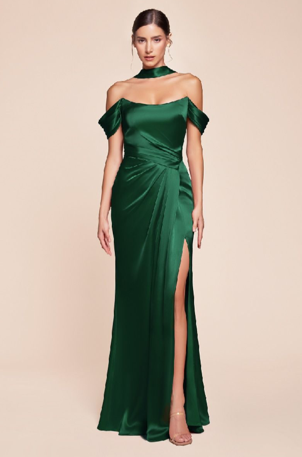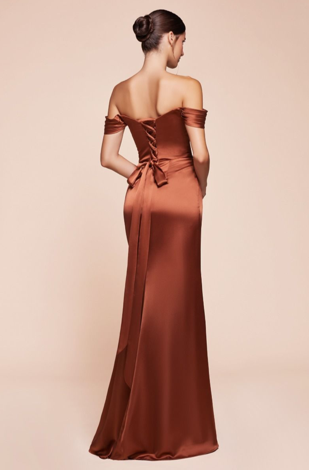 This fitted gown features a sweetheart off-the-shoulder design with a gathered hipline and elegant leg slit, crafted from luxe satin. The structured boned bodice provides support, while the lace-up corset back can also wrap around the neck for a unique touch. Perfect for bridesmaids, wedding guests, or formal events, this dress offers both sophistication and allure.