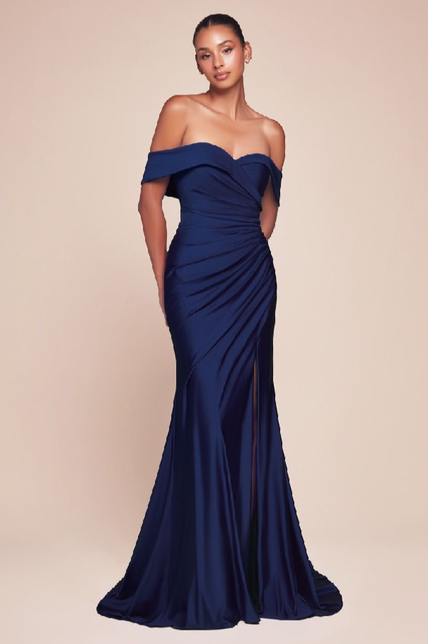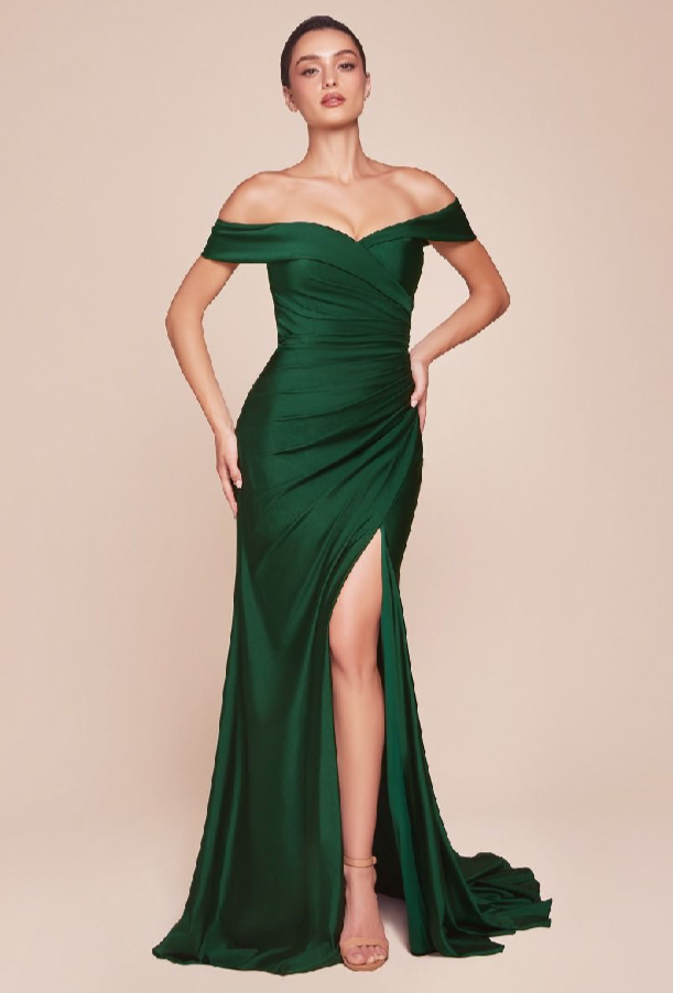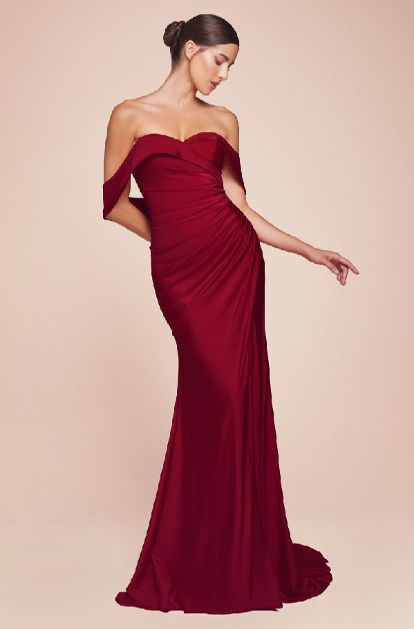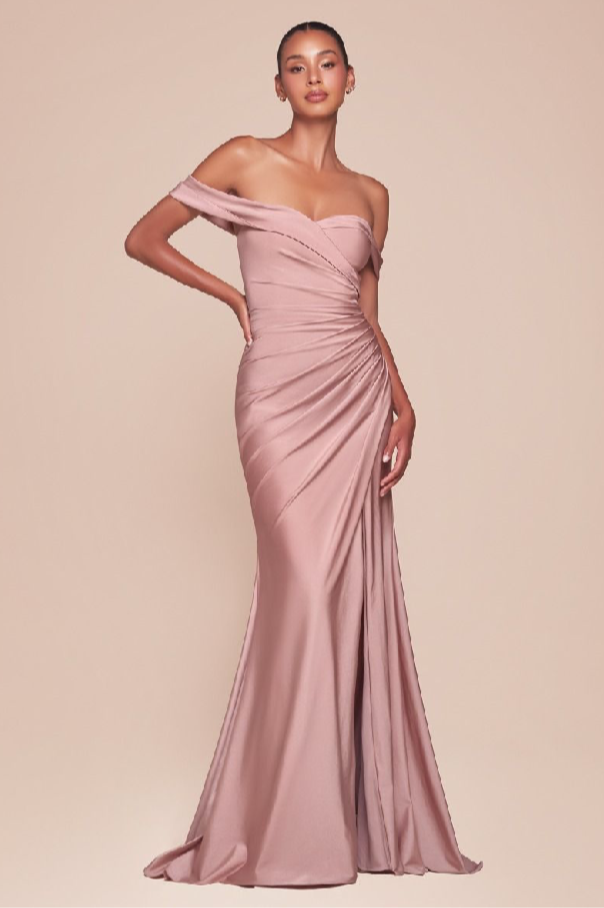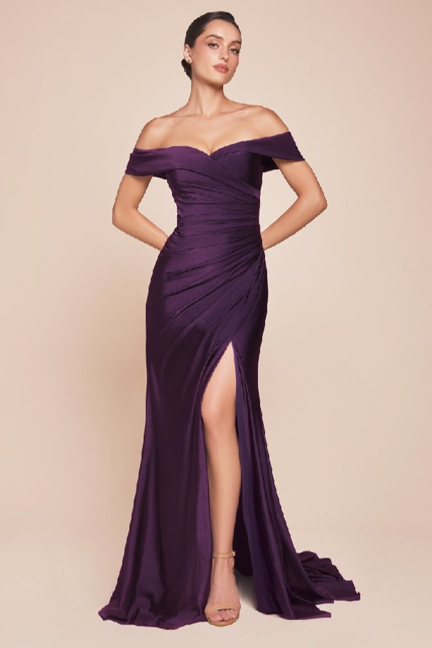 This fitted dress features a sweetheart off-the-shoulder neckline, a flattering pleated waistline, and a chic leg slit. Crafted from stretch spandex satin, it hugs your curves while offering comfortable movement. Ideal for bridesmaids, wedding guests, or formal events, this dress effortlessly blends elegance with a modern fit.