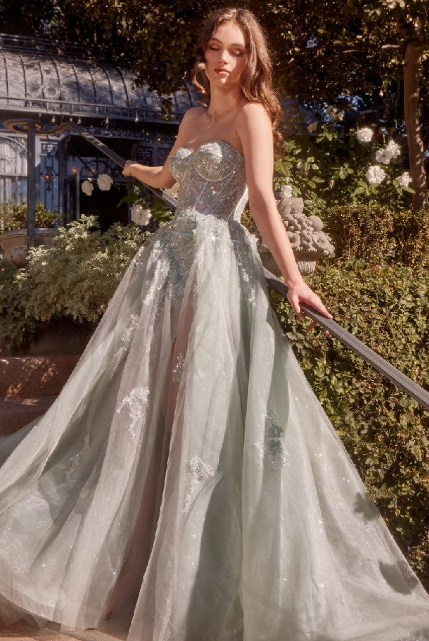 This glamorous ball gown features a strapless sweetheart neckline and an intricately embellished bodice, bringing a touch of sparkle to your special occasion. The asymmetrical A-line skirt, crafted from layered tulle, flows elegantly with a daring slit, while the short underskirt adds volume for a dramatic effect. Perfect for prom or formal events, the structured bodice with a lace-up corset back ensures a flattering, customized fit.